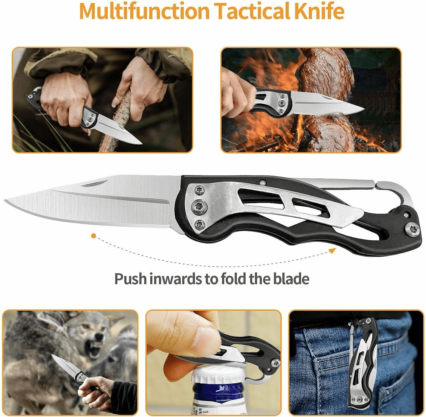 MULTI-FUNCTIONAL - Survival kits camping portable multi-tool box outdoor flashlight set tools. Car first aid kit; camping first aid kit; outdoor multi-purpose tool box; ready to go; is your little friend with peace of mind. The survival kits in this 10-piece set of survival kits are versatile; and there are dozens of functions in a few simple tools to meet the diverse needs of outdoor survival. The emergency blanket 82" x 52" size accommodates tall adults.