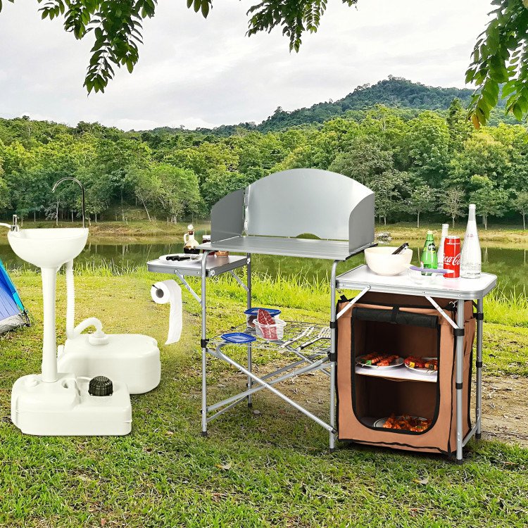 1.Folding Design with Multi-functionality: This camping table with a folding design provides you with portable to use and space-saving at home. And it's easy for you to open, set up, and close in less than a minute. In addition, there are two shelves of zippered bag that protects your food from bugs and animals. The removable steel windscreen protects your food from the weather.