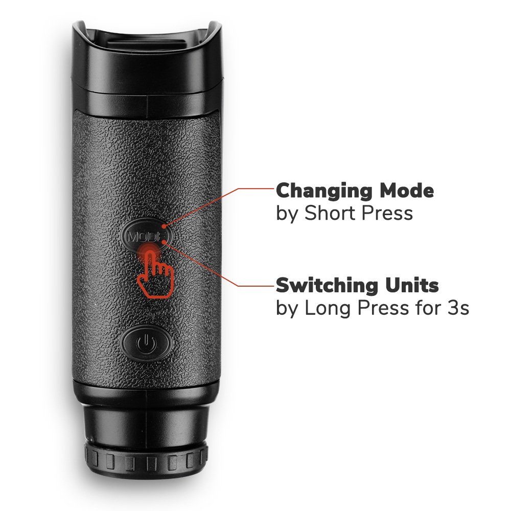 Safe & Easy to Use - CE; RoHS; FDA certificated for safety assurance; Powered by 2x AAA batteries; 1 mode button for changing mode; also for switching units (Meter/Yard) by pressing and holding down for 3 seconds; extremely simple operation for your convenience