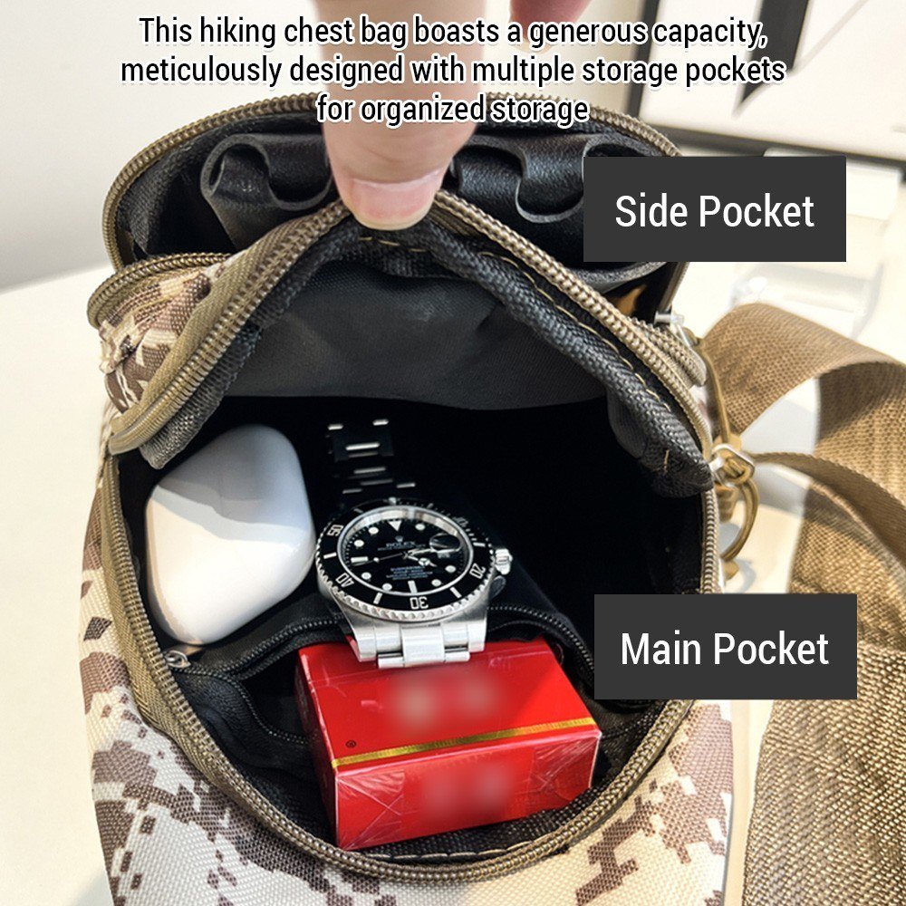 1.This hiking chest bag boasts a generous capacity, meticulously designed with multiple storage pockets for organized storage.