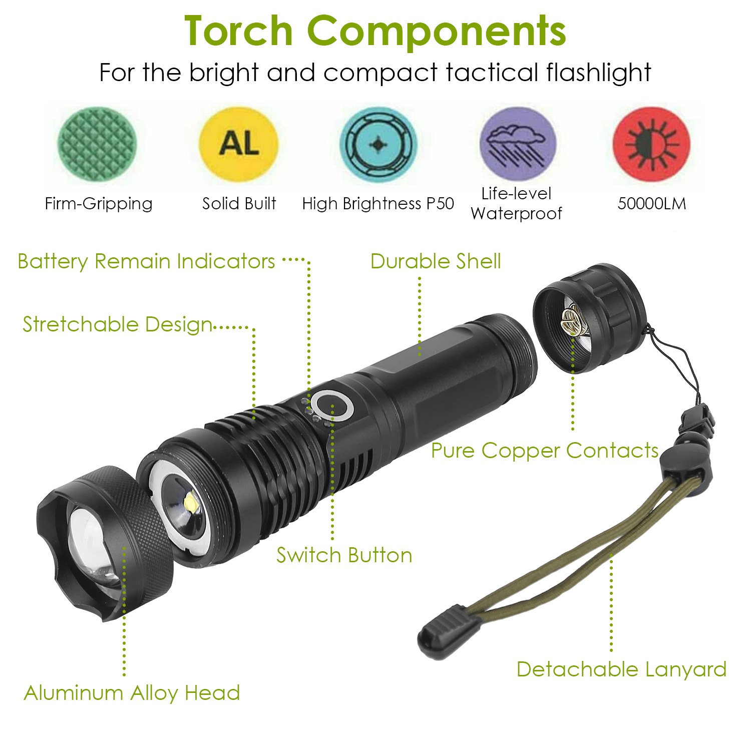 Home > Tactical LED Flashlight Zoomable Rechargeable Search Light Torch 50000LM with 5Modes SOS Night Light For Night Walking Adventures