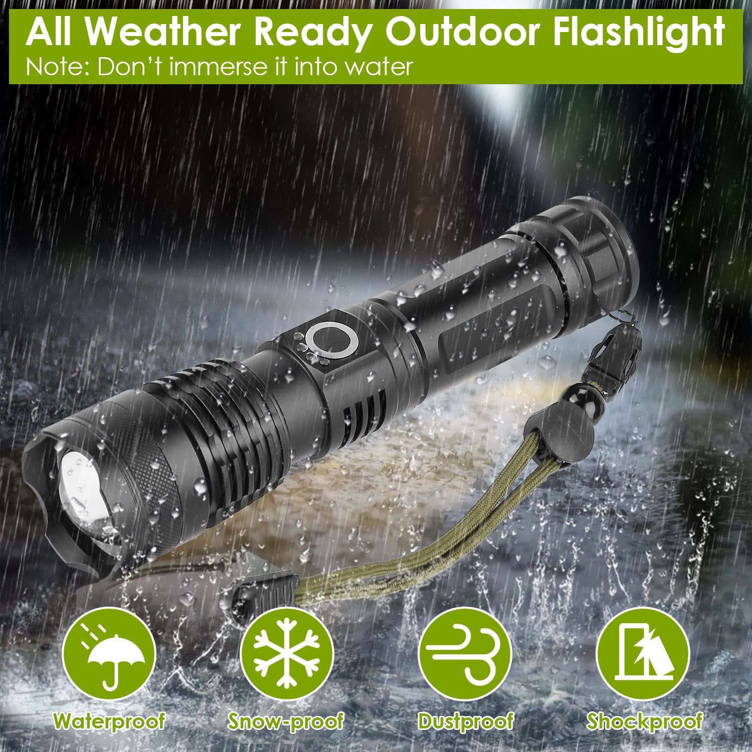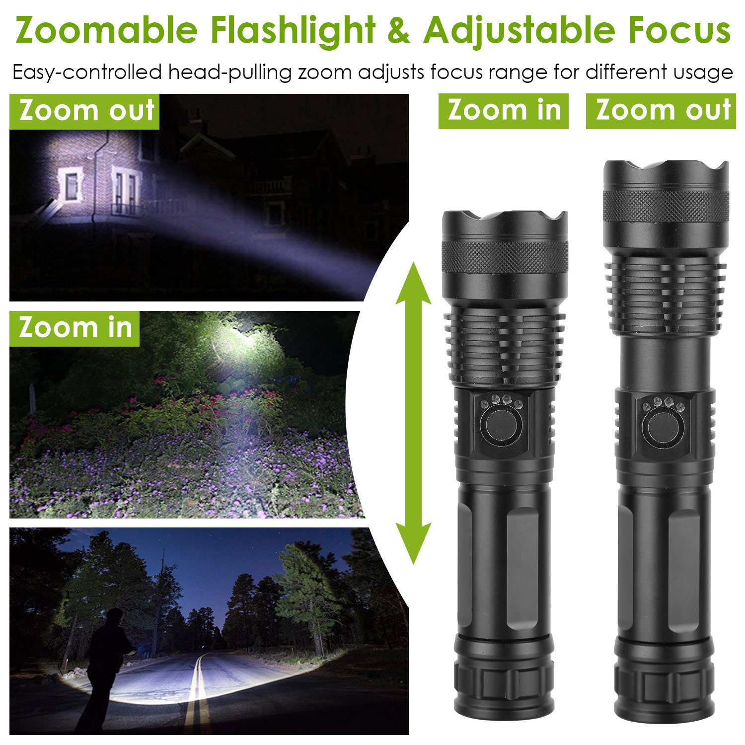 *Zoomable Flashlight & Adjustable Focus*:Our premium P50 LED torch supports 1640ft lighting range;easy-controlled head-pulling zoom adjusts focus range for different usage,stretching to adjust its focus and get spot beam and flood beam you need. Bright zoomable focus is optimal for distant observation and wide range illumination.